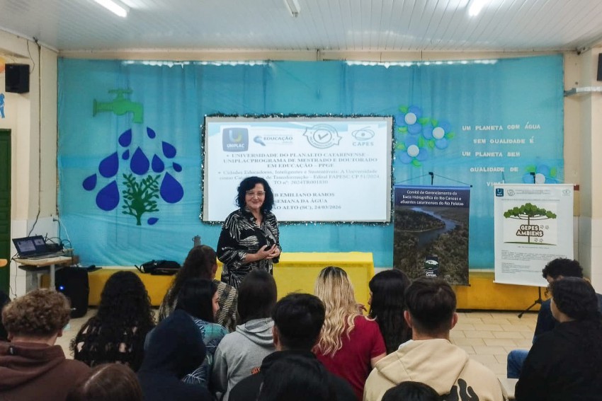 No dia 24/3/2026, a professora Dra. Lucia Ceccato de Lima, pesquisadora na área de educação ambiental, participou como palestrante de uma atividade realizada na Escola de Educação Básica Emiliano Ramos, em Capão Alto, durante a programação da Semana da Água. A participação ocorreu por meio do projeto “Cidades Educadoras, Inteligentes e Sustentáveis: A Universidade como Catalisadora de Transformação – FAPESC CP 51/2024”, do qual a professora Lucia também faz parte.