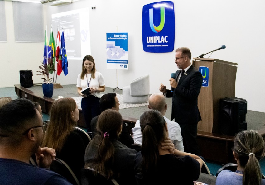 Na quinta-feira (05/03) o Curso de Administração realizou a aula inaugural deste semestre, com apresentação da palestra “Tendências, desafios e oportunidades na Administração na era da Inteligência Artificial”, pelo Administrador e professor Jean Abreu, Conselheiro do CRA/SC.